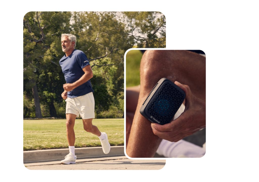 RecoveryTherm Cube can be used as a handheld device or securely fastened to the treatment area using the Cube Strap Frame and straps provided. Use the device directly on the skin to maximize benefits or through light clothing if desired. To use as a handheld device, place the device on the intended treatment area with the Therabody logo facing out. Grip the device using the recommended flat grip area on each side. Do not cover air vents or lay on top of the device. Use the device by either holding it still on the treatment area or gently massaging.