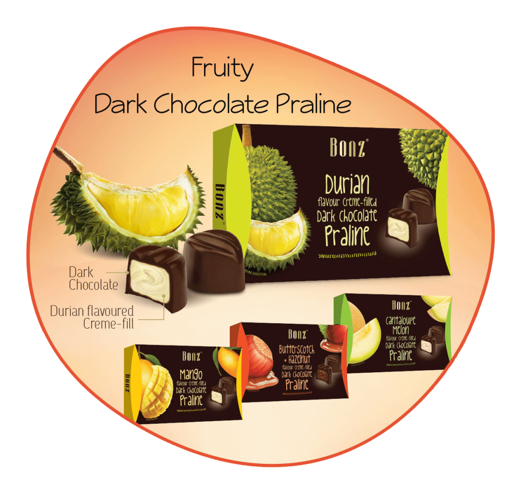 Flavours : Dark • Milk • Mango & Milk • Durian & Milk • Packing: 50g x 42 – 20RF Capacity: 1580 cartons • Shelf Life: 18 months