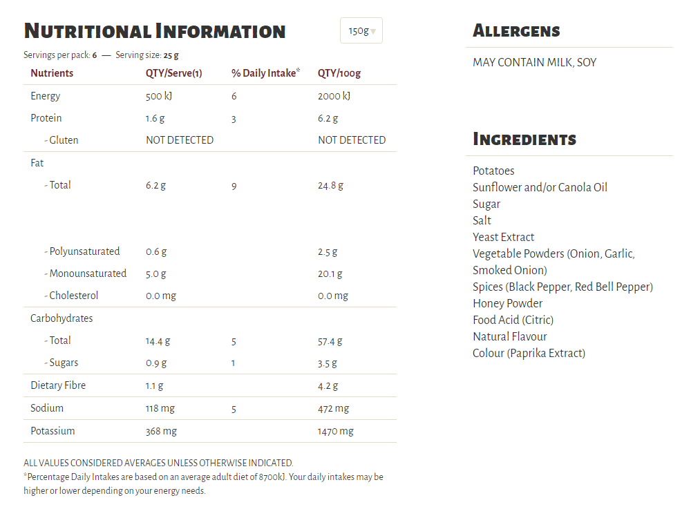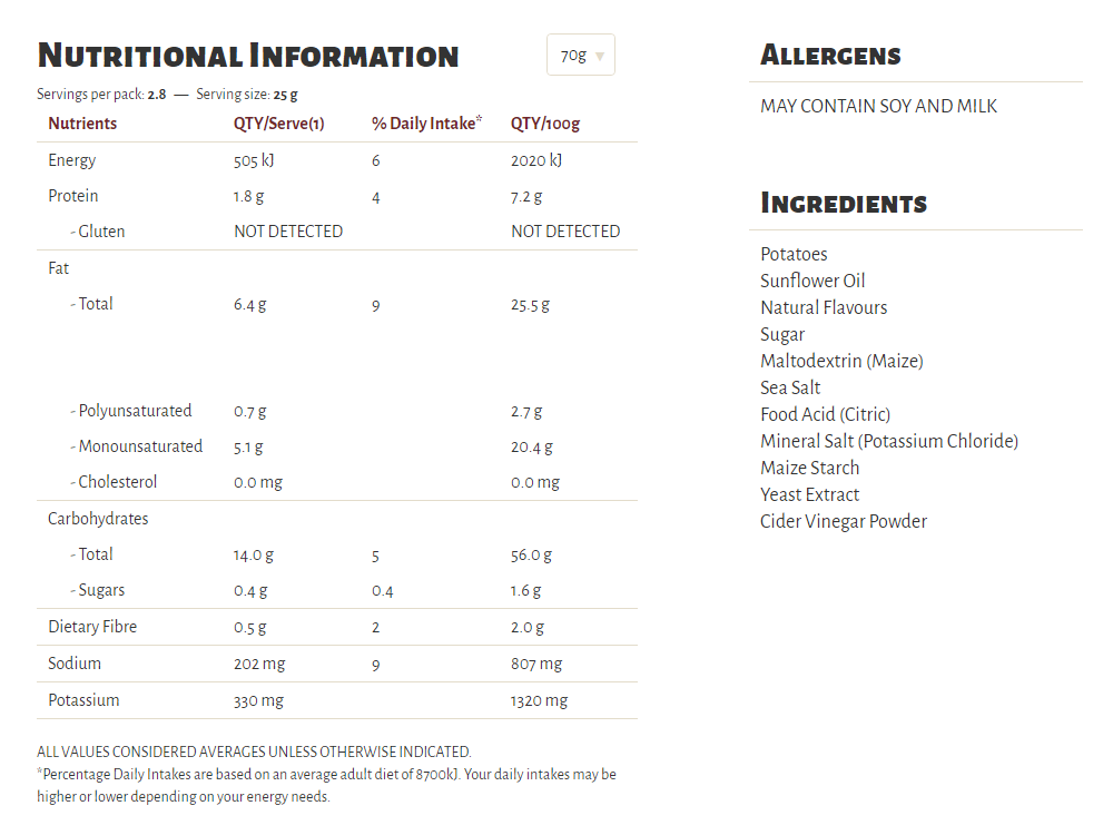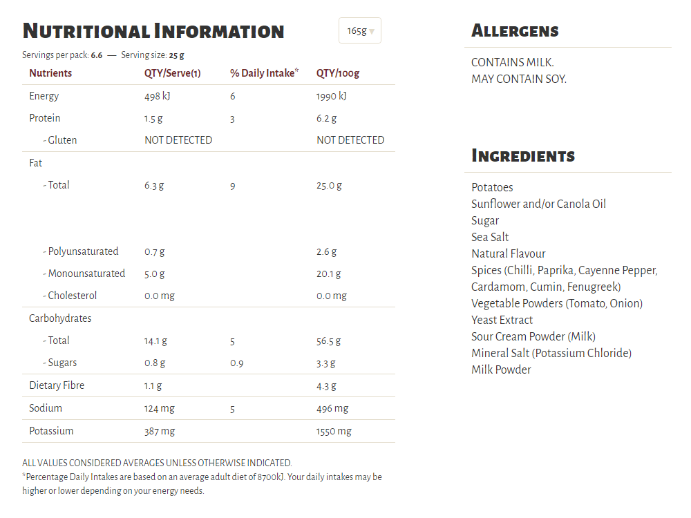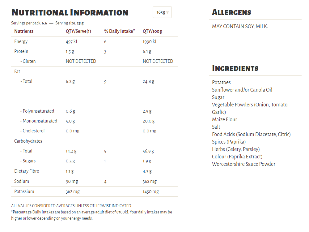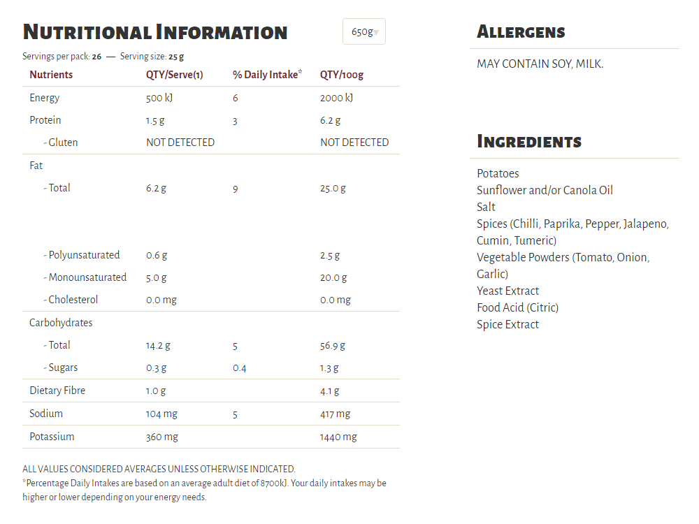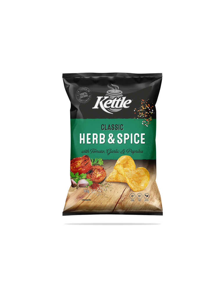 Slow cooked the unique Kettle way, our Herb & Spice flavour is a long-time favourite in our recipe collection. A well-perfected combination of sun-ripened tomatoes and our secret spices, our seasoning is a perfect topper for some very crunchy potato chips which are cooked in sunflower oil and/or canola oil, 100% natural and gluten free!